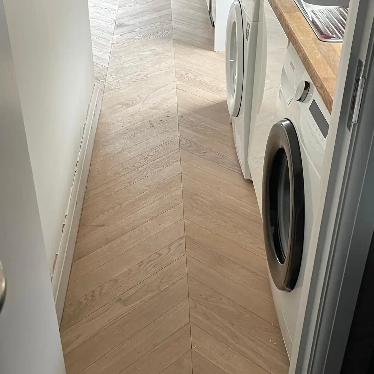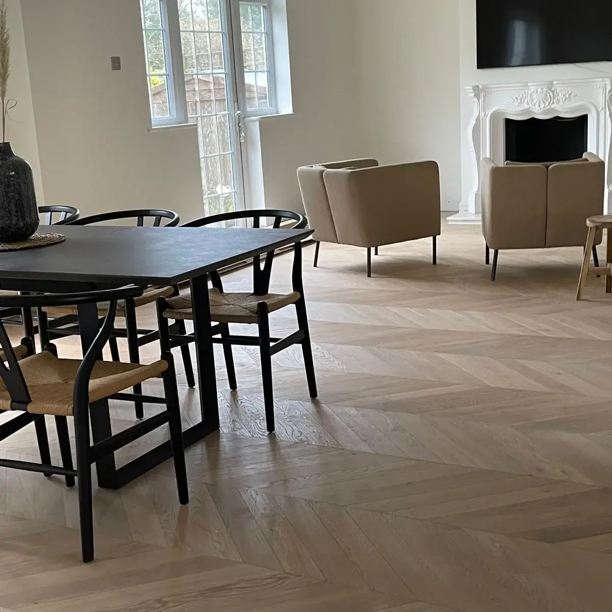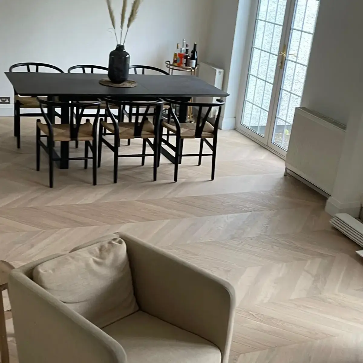 This project involved the installation of bespoke chevron wood flooring at a private residence on the outskirts of London. Precision-laid chevron patterns were expertly installed using premium wood flooring, creating a timeless and sophisticated finish. Careful attention was given to alignment, detailing, and craftsmanship to deliver a luxurious, seamless result that elevates the entire space.